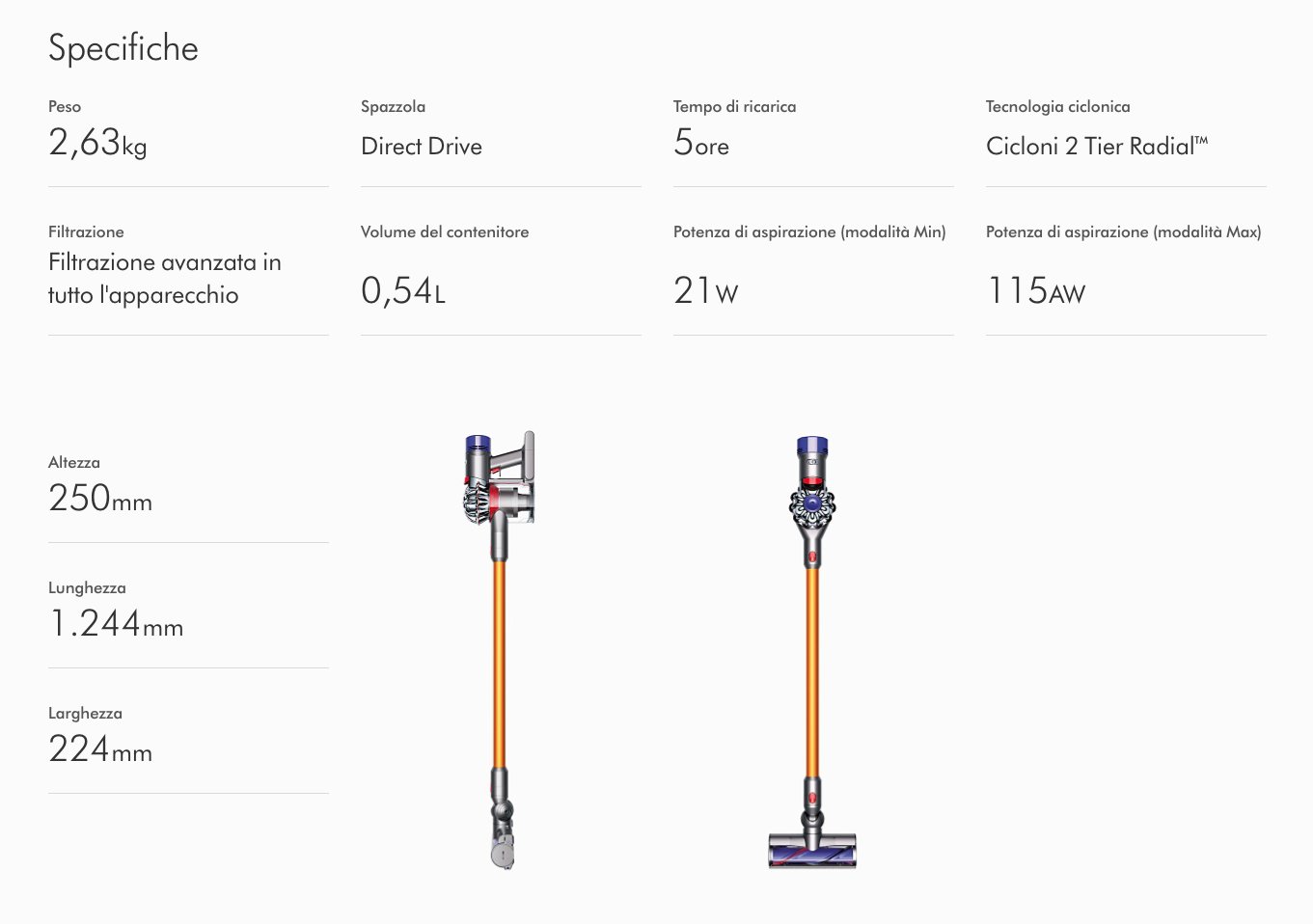 L'aspirapolvere Dyson V8 Absolute garantisce fino a 40 minuti di potente aspirazione Dyson. Le spazzole aggiuntive consentono all'aspirapolvere Dyson V8 Absolute di pulire diversi tipi di pavimenti e superfici. Il meccanismo a grilletto permette di rilasciare lo sporco in modo igienico. Include sette accessori per pulire a fondo in tutta la casa.