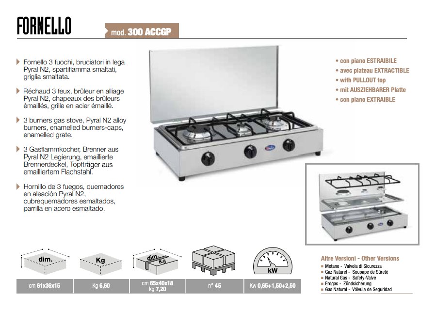 Fornello 3 fuochi, bruciatori in lega Pyral N2, spartifiamma smaltati, griglia smaltata.