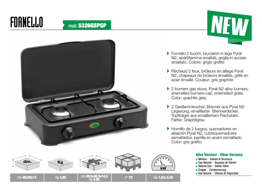 Fornello 2 fuochi, bruciatori in lega Pyral N2, spartifiamma smaltati, griglia in acciaio smaltato.