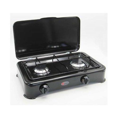 Fornello a gas a 2 fuochi, smaltato nero, con coperchio, bruciatori in lega Pyral N2, spartifiamma smaltati, griglia in acciaio smaltato.
