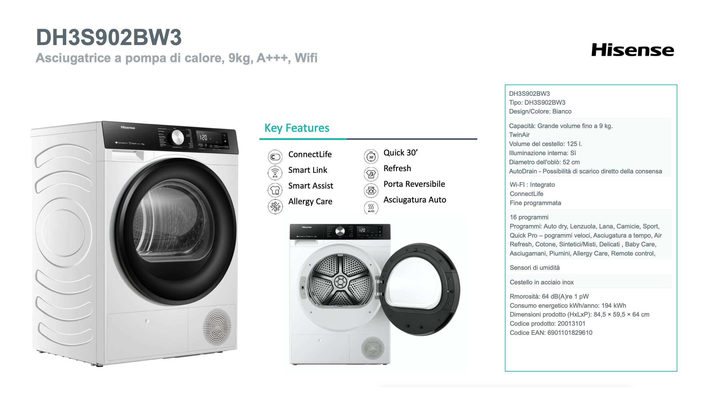 Asciugabiancheria 9 Kg 3S DH3S902BW3 White classe C