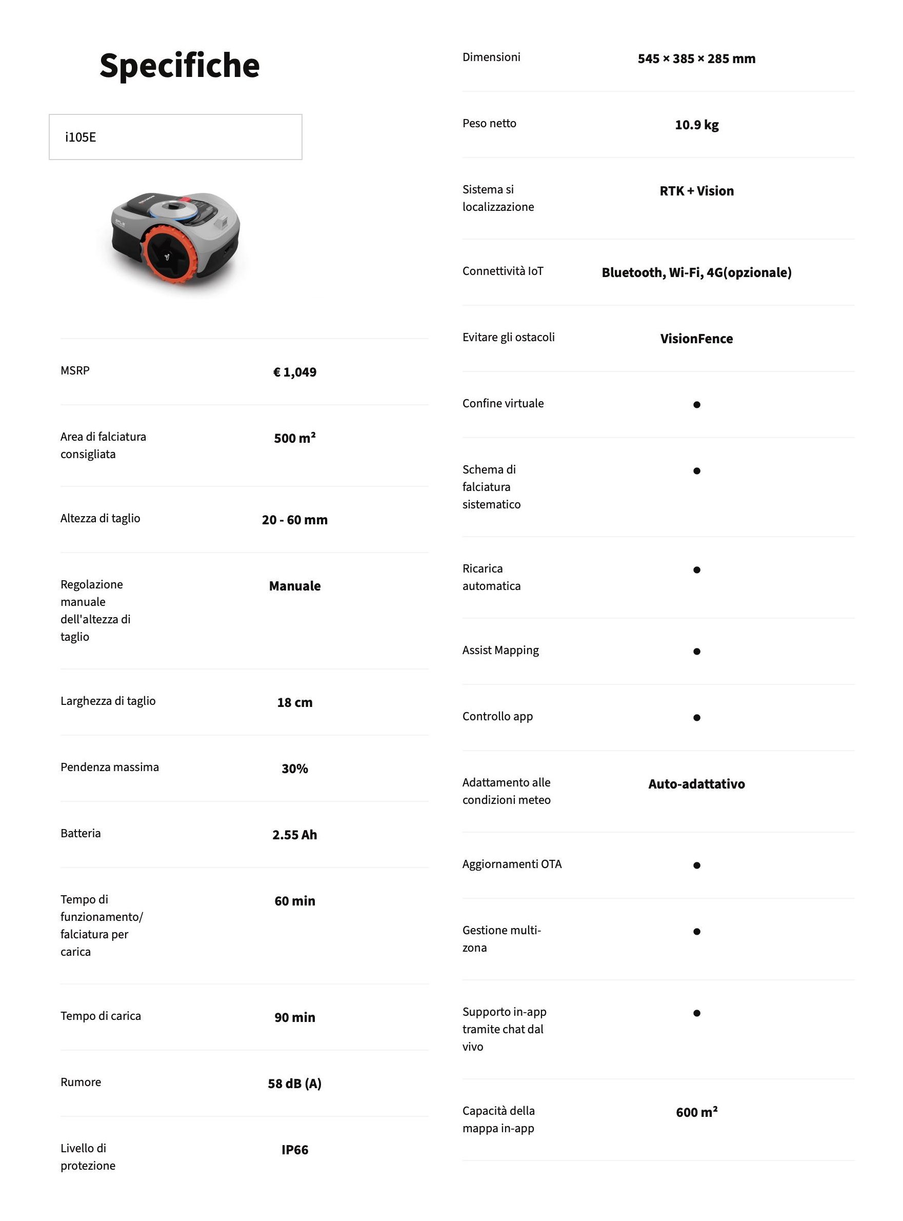 Robot tagliaerba senza filo di ultima generazione, più piccolo e più intelligente, senza filo perimetrale con mappatura assistita basata sull'AI. Navimov i105E ti permette di curare e mantenere impeccabile il tuo prato rimanendo costantemente aggiornato anche da remoto grazie al supporto dell'app Navimow. Manutenzione efficiente e impeccabile del prato. Falcia esattamente come vuoi tu, si ricarica in modo intelligente e continua la falciatura fino al termine del lavoro. Cambia la direzione della falciatura dopo una copertura del 100%, così il tuo prato rimane sano e sembra fresco. Configurazione rapida e senza fili. Collega e controlla il tuo robot tagliaerba tramite l’app Navimow. Con pochi tocchi puoi impostare confini virtuali, contrassegnare le zone vietate e tracciare canali sicuri per connettere più zone. Una mappatura senza sforzo, grazie alla nuovissima funzione Assist Mapping basata sull'IA, Navimow identifica i bordi del prato durante la mappatura e naviga e mappa automaticamente l'intera area di lavoro!