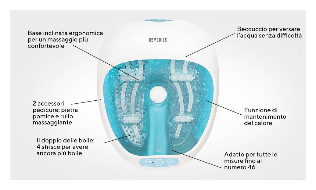 HoMedics Foot Spa è un massaggiatore piedi con 4 funzioni in 1: idromassaggio, massaggio vibrante (con o senza acqua), magnetoterapia (4 magneti posizionati nei punti base della riflessologia per un beneficio naturale) e calore con effetto distensivo. Si adatta fino al numero 47.