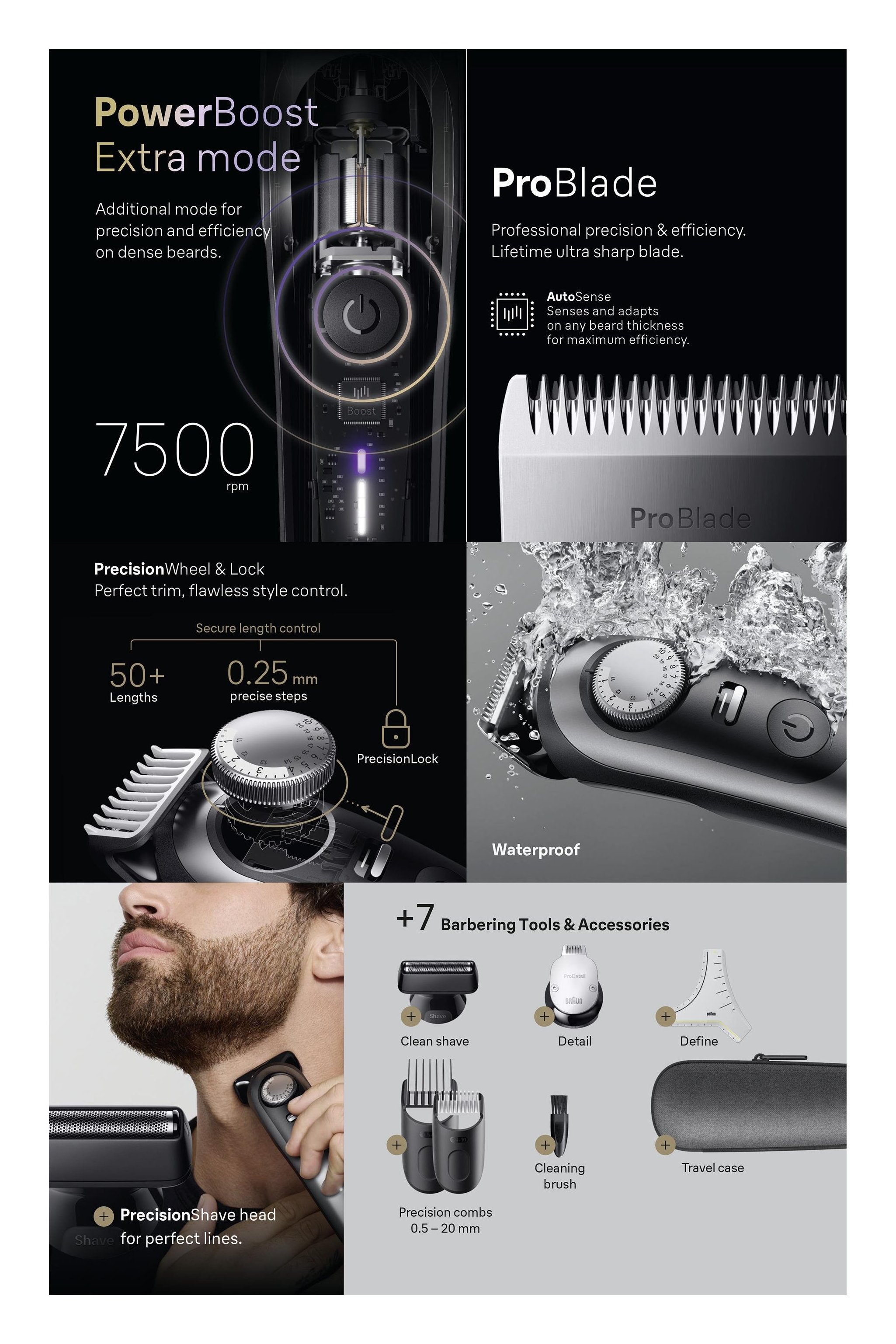 Precisione professionale e controllo al 100%: il miglior regolabarba Braun, Series 9, ti consente di rifinire, radere e definire i contorni e i dettagli con accessori professionali premium per linee perfette, sfumature pulite e rifiniture uniformi. Regolazione altezza taglio da 0,5 a 20mm