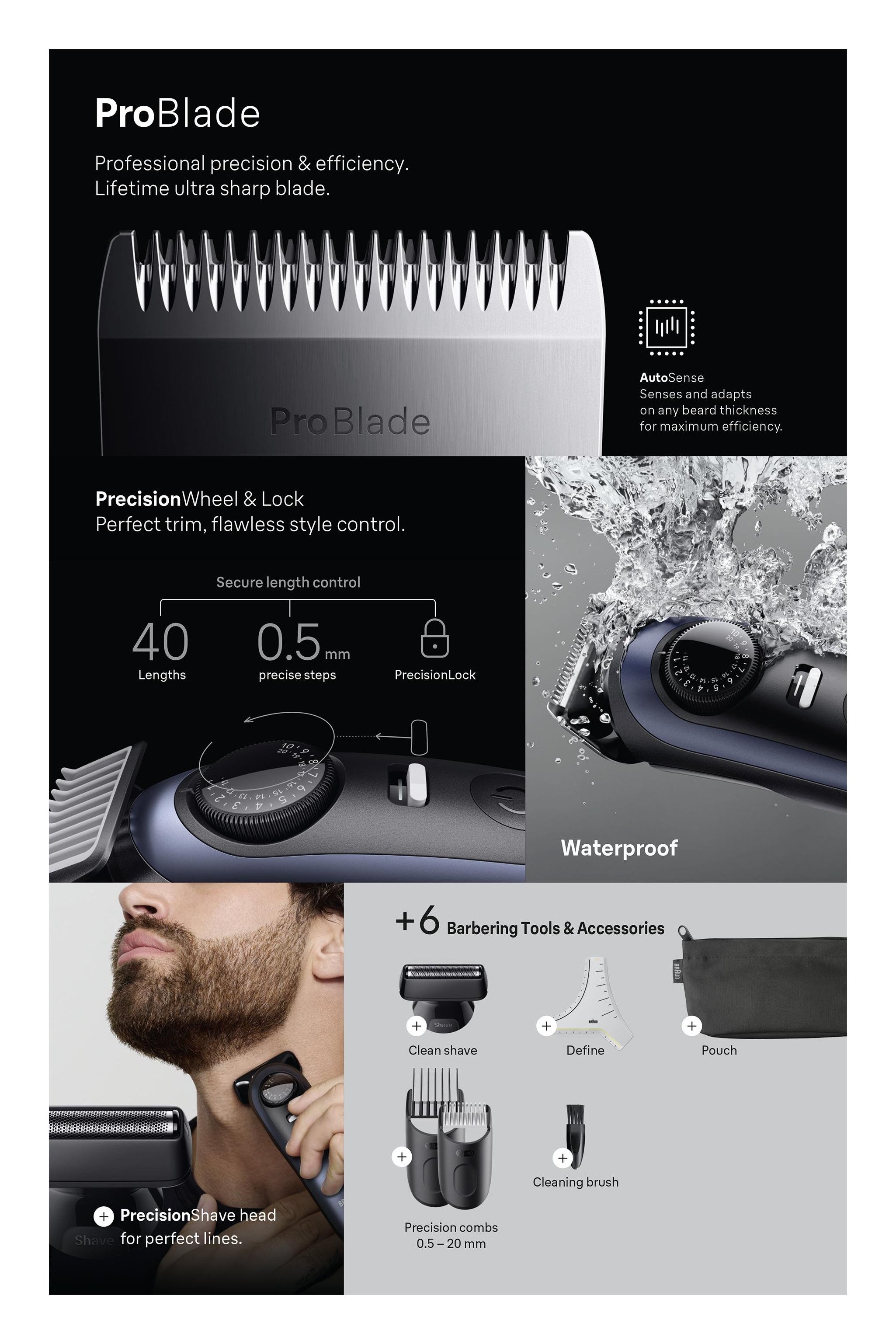 Con la lama Ultra Sharp ProBlade di lunga durata e la tecnologia AutoSense, questo regolabarba cattura anche i peli più ostinati. Niente più errori con PrecisionLock e controllo dello stile impeccabile con 40 impostazioni di lunghezza. Che tu regoli, rada, rifinisca o dettagli, questo regolabarba fornisce i migliori strumenti per linee perfette, sfumature e finiture. Regolazione altezza taglio da 0,5 a 20mm