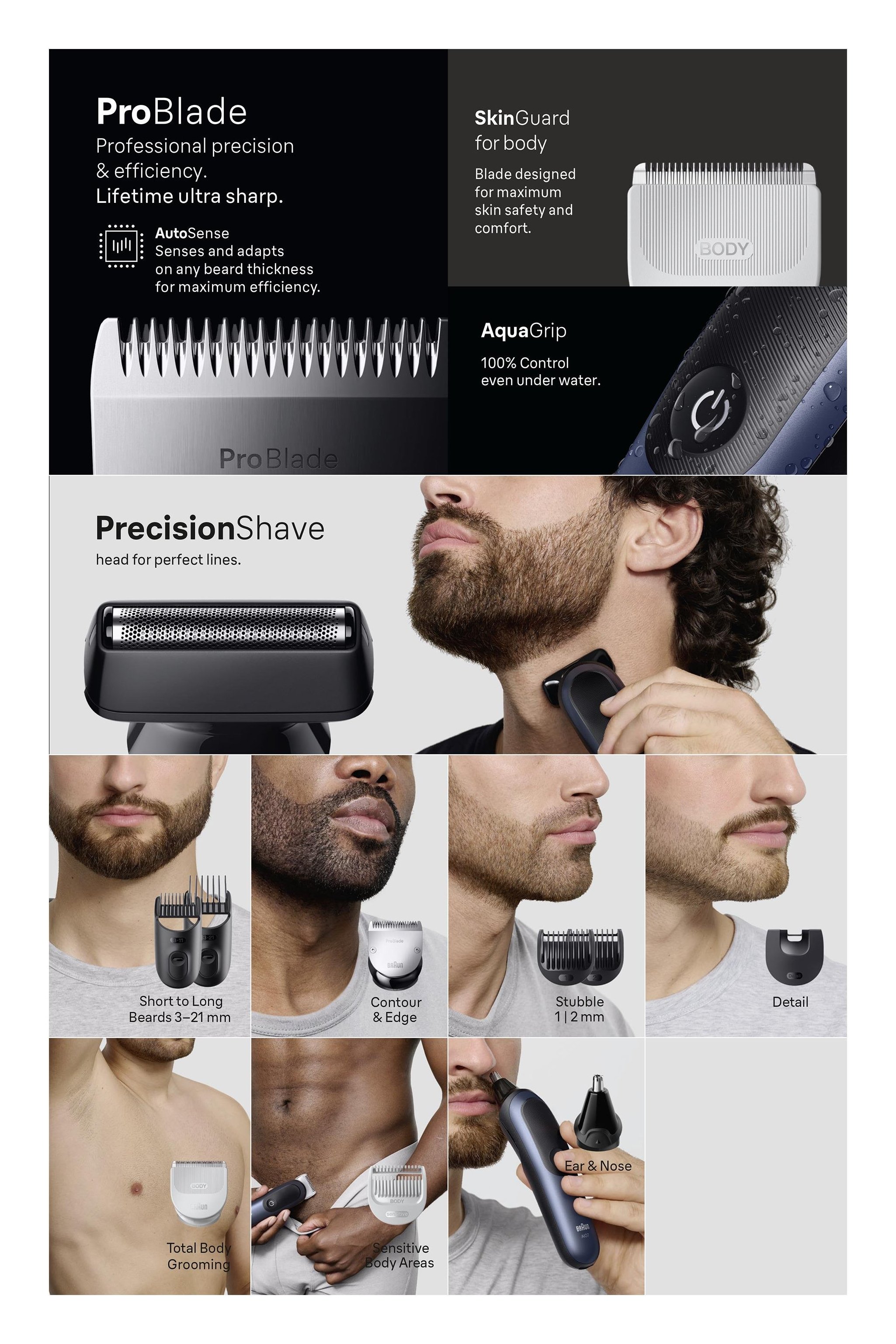 Styling professionale e senza sforzo al 100%: il set 11 in 1 di Braun per la cura personale dalla testa ai piedi contiene strumenti selezionati per rifinire barba, peli del naso e delle orecchie, tagliare i capelli e prendersi cura del corpo. Regolazione altezza taglio da 0,5 a 21mm