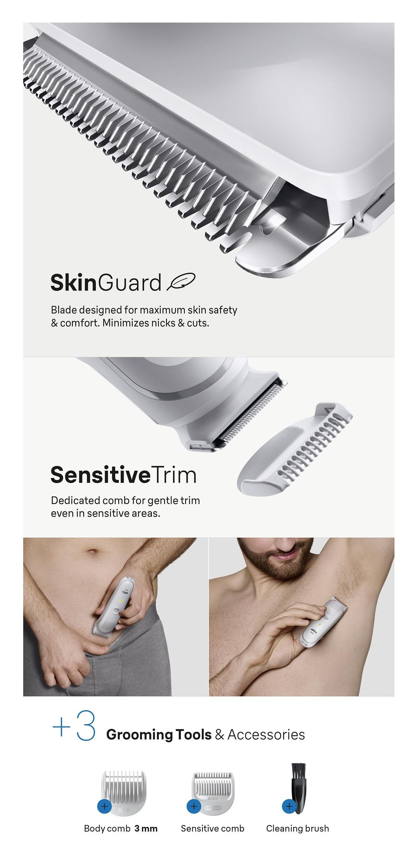 Questo strumento per la cura del corpo dispone della tecnologia SkinGuard per minimizzare tagli e graffi, permettendoti di curare e rifinire ovunque. Il Body Groomer viene fornito con un Pettine Sensibile staccabile per garantire un'esperienza sicura e confortevole prevenendo il contatto della pelle con la lama. 100% impermeabile.