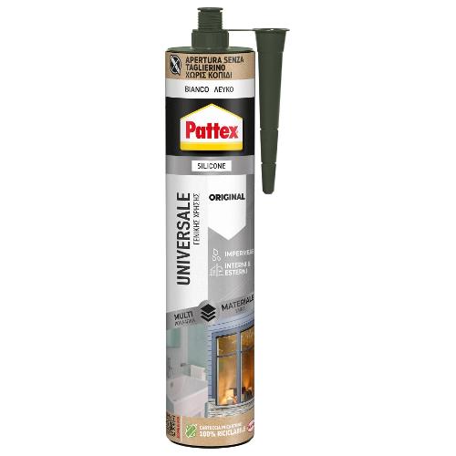 Silicone acetico universale nella nuova cartuccia ecologia in cartone 100% riciclabile e nuova apertura senza uso di taglierino Sigillatura di tutti i materiali non porosi come vetro, metallo, ceramica, legno verniciato e la maggior parte delle materie plastiche (tranne PE, PP, PTFE).