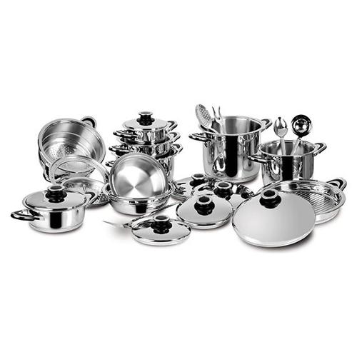 Composizione: pentola con coperchio cm. 20 e 24, casseruola fonda con coperchio da cm.16, 20, 24, casseruola bassa con coperchio cm. 20, griglia cm. 20, bistecchiera con coperchio bombato cm. 28, colacuoci cm. 24 e set accessori da 8 pz