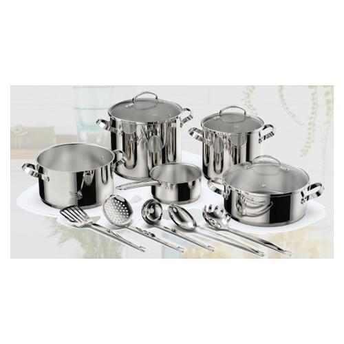 Composizione: Casseruola fonda 1 manico cm 16. Casseruola fonda cm 24 con coperchio. Pentola con coperchio cm 20. Pentola cm 24. Casseruola bassa cm 26 con coperchio. Mestolo, cucchiaione, schiumarola, prendispaghetti, paletta.