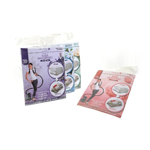 Busta salvaspazio con valvola aspirazione compatibile con tutti gli aspirapolvere. Ideale per piumoni, coperte e cuscini, ne riduce il volume fino al 75%