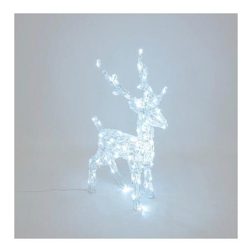Renna 3d, alta 65 cm in acrilico morbido con 80 led bianco. Telaio metallo verniciato bianco, luce fissa, trasformatore bassa tensione di sicurezza con timer on-off 8-16 ore disinseribile tramite pulsante luminoso, ip44 uso esterno e interno, cavo alimentazione trasparente di 4 metri.