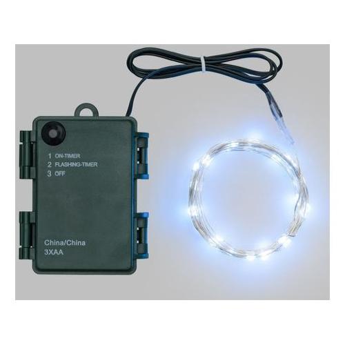 Catena lineare 8m 80 microled bianco ø1,5mm, cavo metallo argento metal silver, memory controller integrato nel porta batterie luce fissa + 7 giochi di luce selezionabili + off, timer on-off 8-16 ore, a batteria 3xaa 1,5v, ip44 uso esterno e interno portatile, dimensioni 8m, scatola pvc color ed espositore pdq try me (xkc art. M80s-c t 3aa pdq).