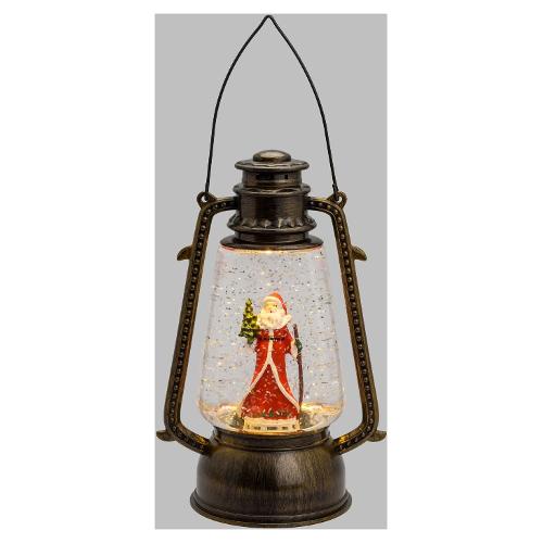 Lanterna con vetro panorama, base rotonda, plastica marrone brunita glitter led bianco caldo, effetto luminoso scintillante con glitter illuminato nell'acqua in movimento all'interno della decorazione, a batteria 4xaaa 1,5v, porta batterie integrato sotto la base, pulsante on-off, predisposizione per alimentazione con trasformatore opzionale