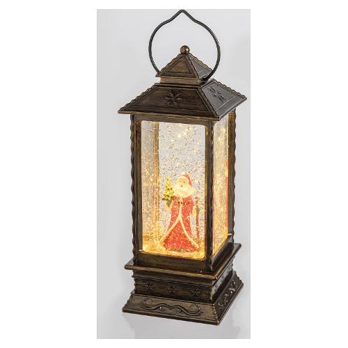 Lanterna rettangolare plastica marrone brunita glitter led bianco caldo, effetto luminoso scintillante con glitter illuminato nell'acqua in movimento all'interno della decorazione, a batteria 4xaaa 1,5v, porta batterie integrato sotto la base, pulsante on- off, predisposizione per alimentazione con trasformatore opzionale