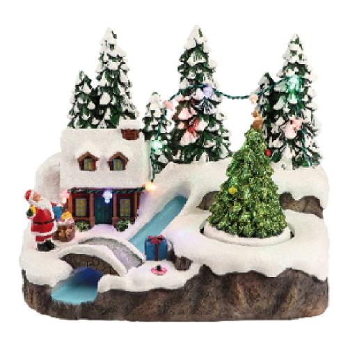 Villaggio in polyresina h15cm ruscello con ponte e albero natale rotante led color, luce fissa, musica natalizia (8 motivi ripetuti in sequenza) disattivabile con interruttore on1 (con musica) - off - on2 (senza musica), con a batteria 3xaa 1,5v (non incluse), porta batterie integrato, predisposizione per alimentazione con trasformatore opzionale, ip20