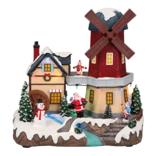 Villaggio polyresina h23cm con mulino a vento rotante led color, luce fissa, musica natalizia (8 motivi ripetuti in sequenza) disattivabile con interruttore on1 (con musica) - off - on2 (senza musica), a batteria 3xaa 1,5v (non incluse), porta batterie integrato, predisposizione per alimentazione con trasformatore opzionale, ip20