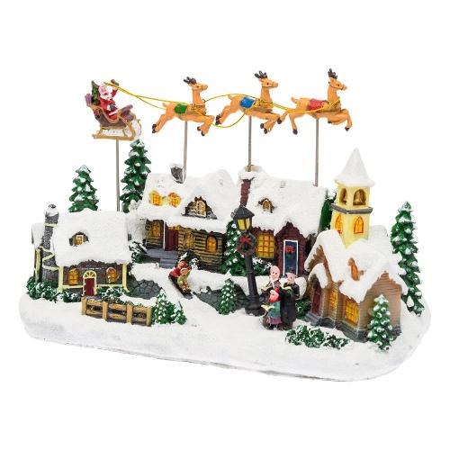 Villaggio innevato con chiesa in polyresina e babbo natale su slitta volante con renne in movimento (4 mov.), Led bianco caldo, luce fissa, musica natalizia (8 motivi ripetuti in sequenza) disattivabile con interruttore on1 (con musica) - off - on2 (senza musica), trasformatore incluso, ip20