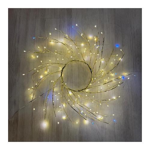 Corona di Rami TIGLIO Champagne ø45cm 160 MicroLED BIANCO CALDO e BIANCO ø1,5mm, Long Leg Led con gambo di 3cm, Cavo Metallo Argento Metal Silver, gioco di luce automatico FlashLED Diamond (144 led B.Caldo a luce fissa + 16 led Flash B.Freddo con lampeggio veloce), Trasformatore SELV di sicurezza, IP44 uso Esterno e Interno, Appendibile e da appoggio, Cavo di Alimentazione Trasparente 5m, Dim. 5m+ø45cm