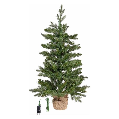 Abete alpino base iuta prelit mod. La h90xø53 cm pvc+pe verde 180 miniled bianco caldo ø3mm reflex, rami mix di diversa forma e colore, 301 punte (220 pe), apertura hinged con rami snodabili non asportabili, memory controller luce fissa + 7 giochi luce + timer giornaliero 8 ore disinseribile con pulsante luminoso integrato nel trasf. Selv di sicurezza, ip44 esterno e interno, cavo di alimentazione verde 4m