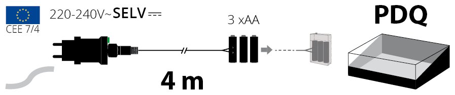 Consente di alimentare dispositivi che richiedono batterie 3xAA senza la necessità di sostituirle continuamente. Lunghezza cavo 4m. Trasformatore SELV di sicurezza con Timer 8 ore On (16 ore Off) disinseribile tramite pulsante luminoso. Spina Europea Shuko CEE 7/4, uso Interno.