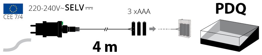 Consente di alimentare dispositivi che richiedono batterie 3xAAA senza la necessità di sostituirle continuamente. Lunghezza cavo 4m. Trasformatore SELV di sicurezza con Timer 8 ore On (16 ore Off) disinseribile tramite pulsante luminoso. Spina Europea Shuko CEE 7/4, uso Interno.