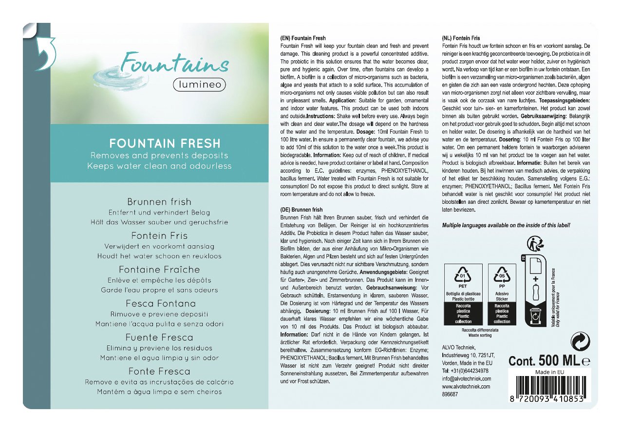 Nel tempo, spesso le fontane possono sviluppare un biofilm. Un biofilm è un insieme di microrganismi come batteri, alghe e lieviti che si attaccano a una superficie solida. Questo accumulo di microrganismi non solo causa inquinamento visibile, ma può anche causare odori sgradevoli. Fountain Fresh manterrà la tua fontana pulita e fresca e ne preverrà i danni. Questo prodotto detergente è un potente additivo concentrato. Il probiotico presente in questa soluzione assicura che l'acqua torni limpida, pura e igienica. Adatto per fontane da giardino, ornamentali e da interno. Questo prodotto può essere utilizzato sia all'interno che all'esterno. Il dosaggio dipenderà dalla durezza dell'acqua e dalla temperatura. Dosaggio: 10 ml di Fountain Fresh in 100 litri d'acqua. Per garantire una fontana costantemente limpida, si consiglia di aggiungere 10 ml di questa soluzione all'acqua una volta alla settimana. Questo prodotto è biodegradabile. L'acqua trattata con Fountain Fresh non è adatta al consumo!