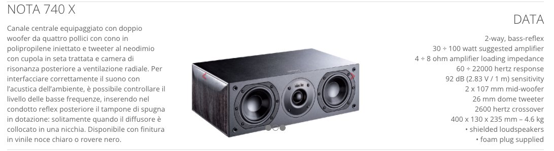 Canale centrale equipaggiato con doppio woofer da quattro pollici con cono in polipropilene iniettato e tweeter al neodimio con cupola in seta trattata e camera di risonanza posteriore a ventilazione radiale.