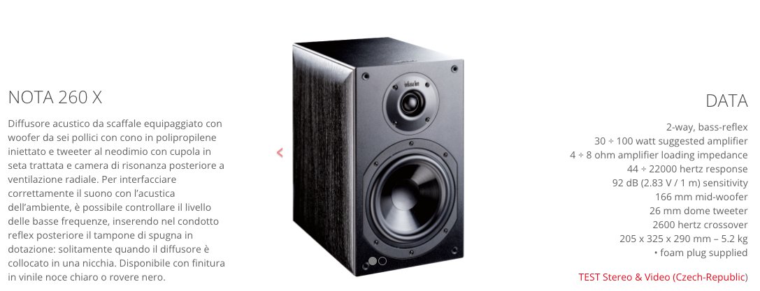 Diffusore acustico da scaffale equipaggiato con woofer da sei pollici con cono in polipropilene iniettato e tweeter al neodimio con cupola in seta trattata e camera di risonanza posteriore a ventilazione radiale. Per interfacciare correttamente il suono con l’acustica dell’ambiente, è possibile controllare il livello delle basse frequenze, inserendo nel condotto reflex posteriore il tampone di spugna in dotazione: solitamente quando il diffusore è collocato in una nicchia.