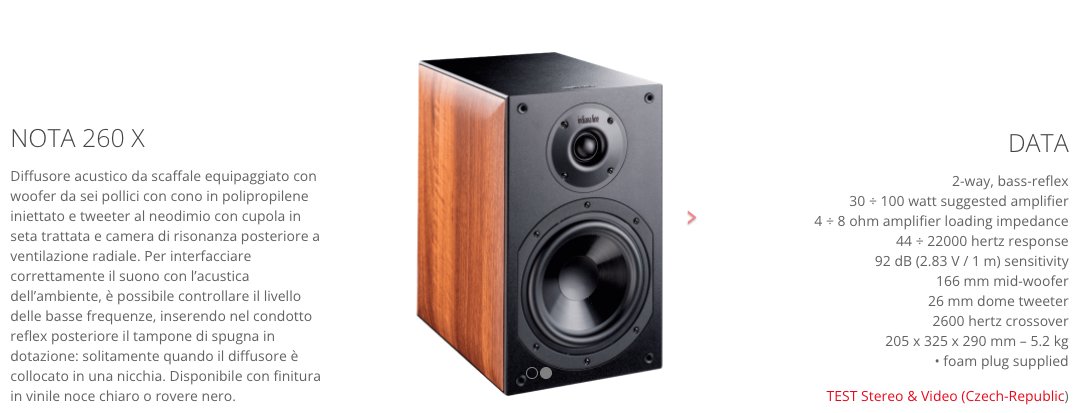 Diffusore acustico da scaffale equipaggiato con woofer da sei pollici con cono in polipropilene iniettato e tweeter al neodimio con cupola in seta trattata e camera di risonanza posteriore a ventilazione radiale. Per interfacciare correttamente il suono con l’acustica dell’ambiente, è possibile controllare il livello delle basse frequenze, inserendo nel condotto reflex posteriore il tampone di spugna in dotazione: solitamente quando il diffusore è collocato in una nicchia.