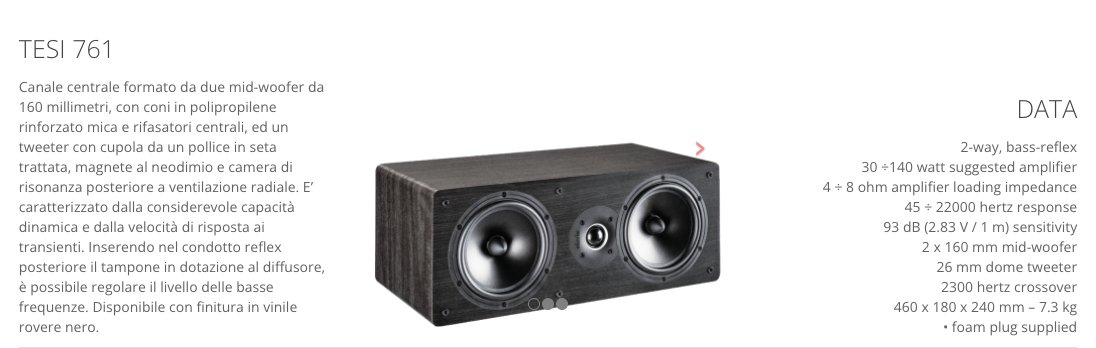 Canale centrale formato da due mid-woofer da 160 millimetri, con coni in polipropilene rinforzato mica e rifasatori centrali, ed un tweeter con cupola da un pollice in seta trattata, magnete al neodimio e camera di risonanza posteriore a ventilazione radiale.