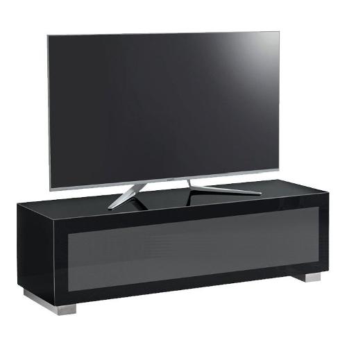 Mobile rivestito in vetro temperato, con apertura a ribalta munito di freno, dotato di passacavo, ripiani in vetro regolabili, vetro laccato che consente l’input del telecomando, ruote pivotanti nascoste