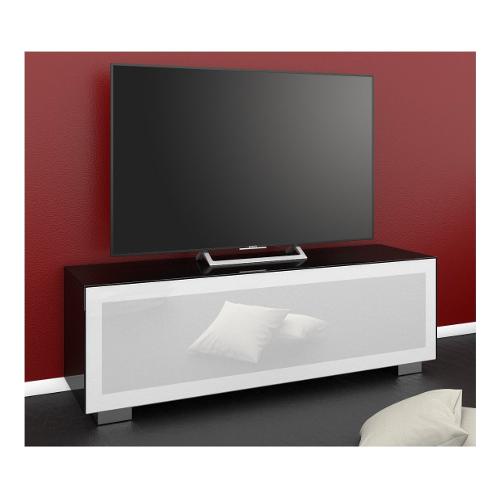 Mobile rivestito in vetro temperato, con apertura a ribalta munito di freno, dotato di passacavo, ripiani in vetro regolabili, vetro laccato che consente l’input del telecomando, ruote pivotanti nascoste