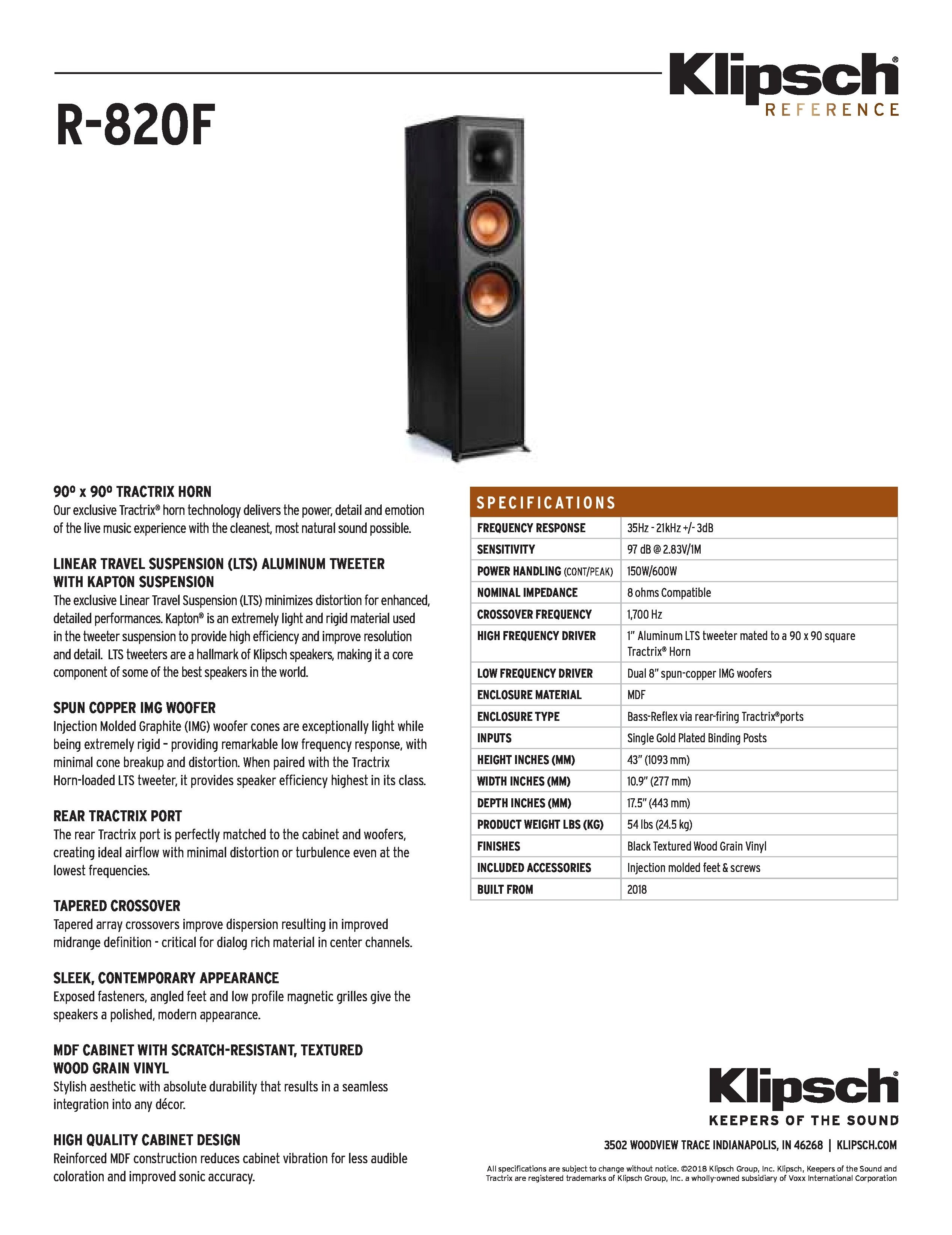 L’altoparlante da pavimento Klipsch R-820F pervade la stanza di dettagli e chiarezza straordinari. Avvalendosi della nostra tecnologia brevettata, ricca di megafoni, e dotato dei woofer in rame spazzolato IMG da 8", il R-820F produce un’acustica naturale che dà vita ai tuoi film e brani musicali.
