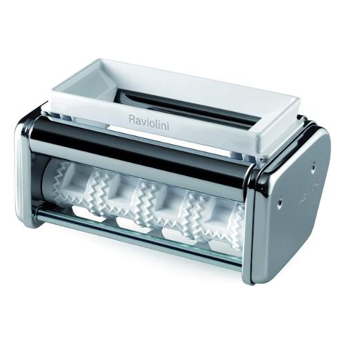 Accessorio per raviolini piccola pasta ripiena di diametro 30 mm. Spessore sfoglia n. 6 del regolatore della macchina per pasta atlas 150. Made in italy prodotto interamente realizzato in italia da marcato s.p.a. Struttura in acciaio cromato con rulli in resina per alimenti e struttura in ABS. Pratico cucchiaio per farcire i raviolini