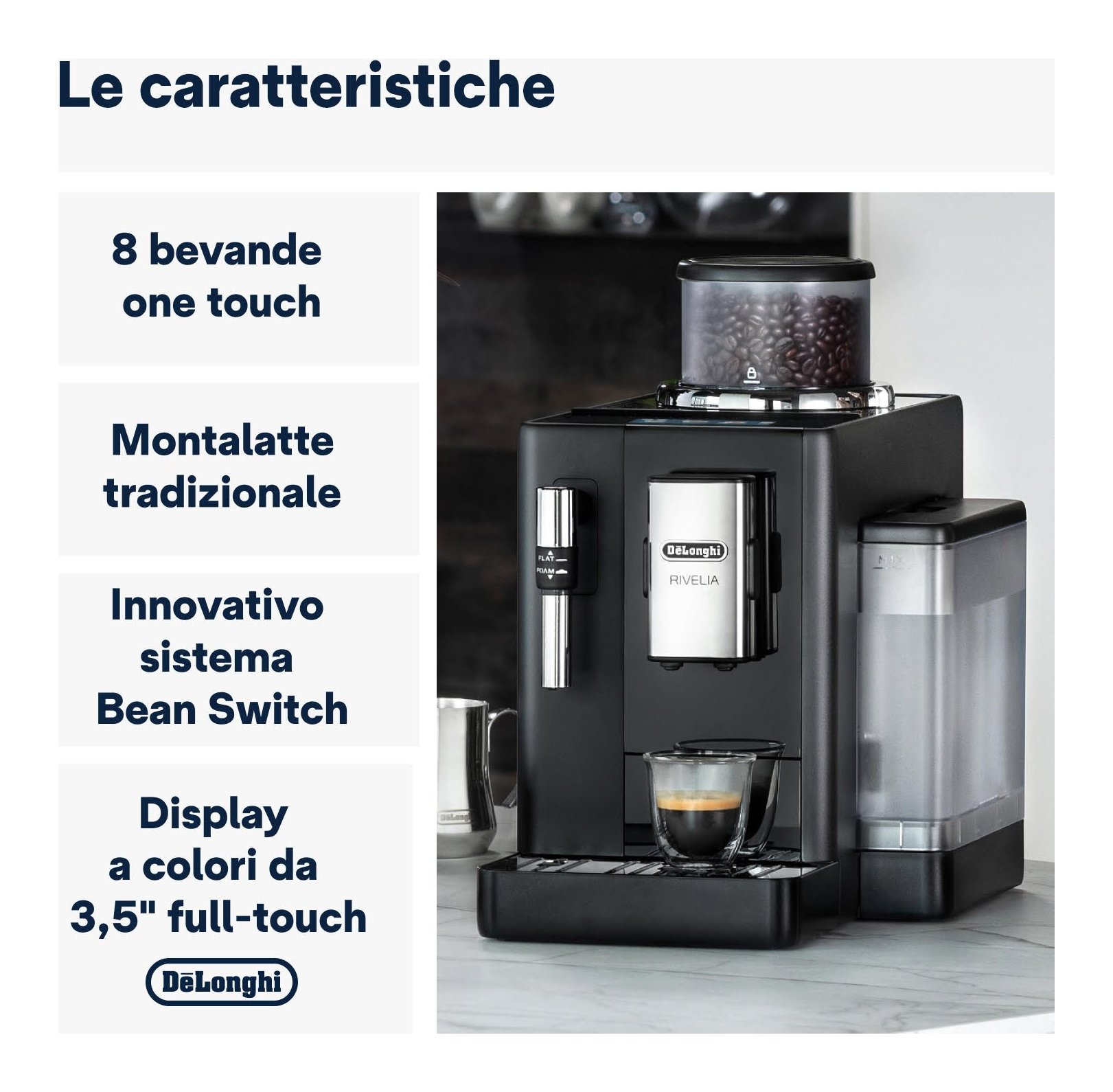 Display full-touch da 3.5" e 4 profili utente con Coffee Routines: con questa funzione Rivelia imparerà la tua routine quotidiana, e programmerà direttamente le tue bevande preferite nell'arco della giornata.