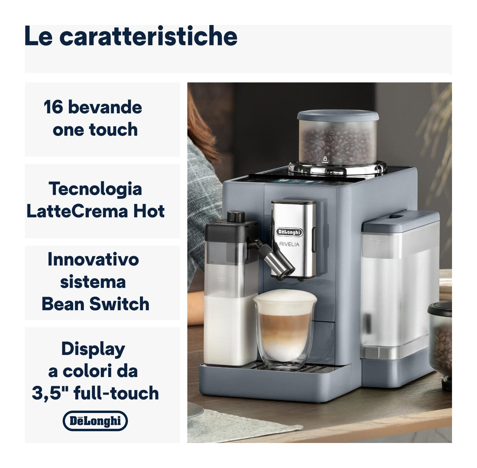 Display full-touch da 3.5" e 4 profili utente con Coffee Routines: con questa funzione Rivelia imparerà la tua routine quotidiana, e programmerà direttamente le tue bevande preferite nell'arco della giornata. La tecnologia LatteCrema di De’Longhi unisce il vapore, aria e latte in proporzioni corrette per creare la migliore schiuma di latte per tutte le bevande desiderate. Il segreto per un crema di latte di altissimo livello, soffice ma densa sta tutto nella caraffa latte e nella sua capacità di mixare gli elementi vapore aria e latte e la possibilità di regolare i parametri in base alla selezione dell’utente.