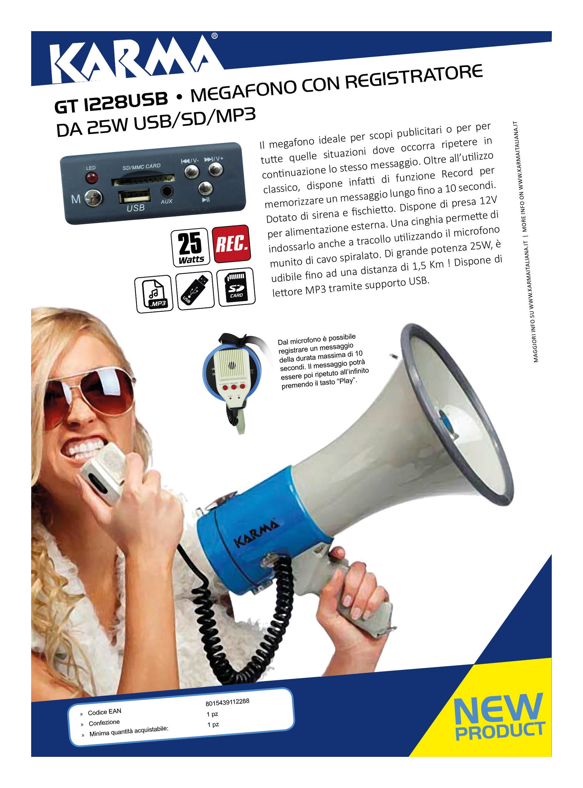 Il megafono ideale per scopi pubblicitari o per per tutte quelle situazioni dove occorra ripetere in continuazione lo stesso messaggio. Oltre all'utilizzo classico, dispone infatti di funzione Record per memorizzare un messaggio lungo fino a 10 secondi. Una volta registrato il messaggio(tramite le semplice pressione di un tasto), avrete la possibilità di riprodurlo in continuazione. Dotato di sirena e fischietto per richiamare l'attenzione o per utilizzi in situazioni di emergenza o pericolo. Dispone di presa 12V per alimentazione esterna. Una cinghia permette di indossarlo anche a tracolla utilizzando il microfono munito di cavo spiralato. Di grande potenza 25W, è udibile fino ad una distanza di 900 mt (in condizioni ottimali) Dispone di lettore MP3 tramite supporto USB.