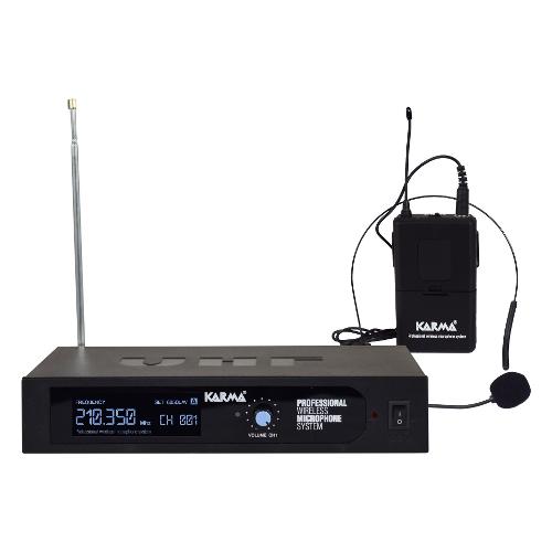 Radiomicrofono VHF con regolatore di volume e presa in uscita sia bilanciata che sbilanciata. Il display mostra la frequenza operativa. Ampio raggio d’azione. Microfono ad archetto con relativo bodypack.