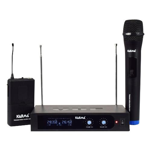 Doppio radiomicrofono VHF con regolatori di volume indipendenti e presa in uscita sia bilanciata che sbilanciata. Il display mostra la frequenze operative dei 2 canali. Ampio raggio d’azione. Inclusi microfono palmare e un microfono ad archetto con relativo bodypack.