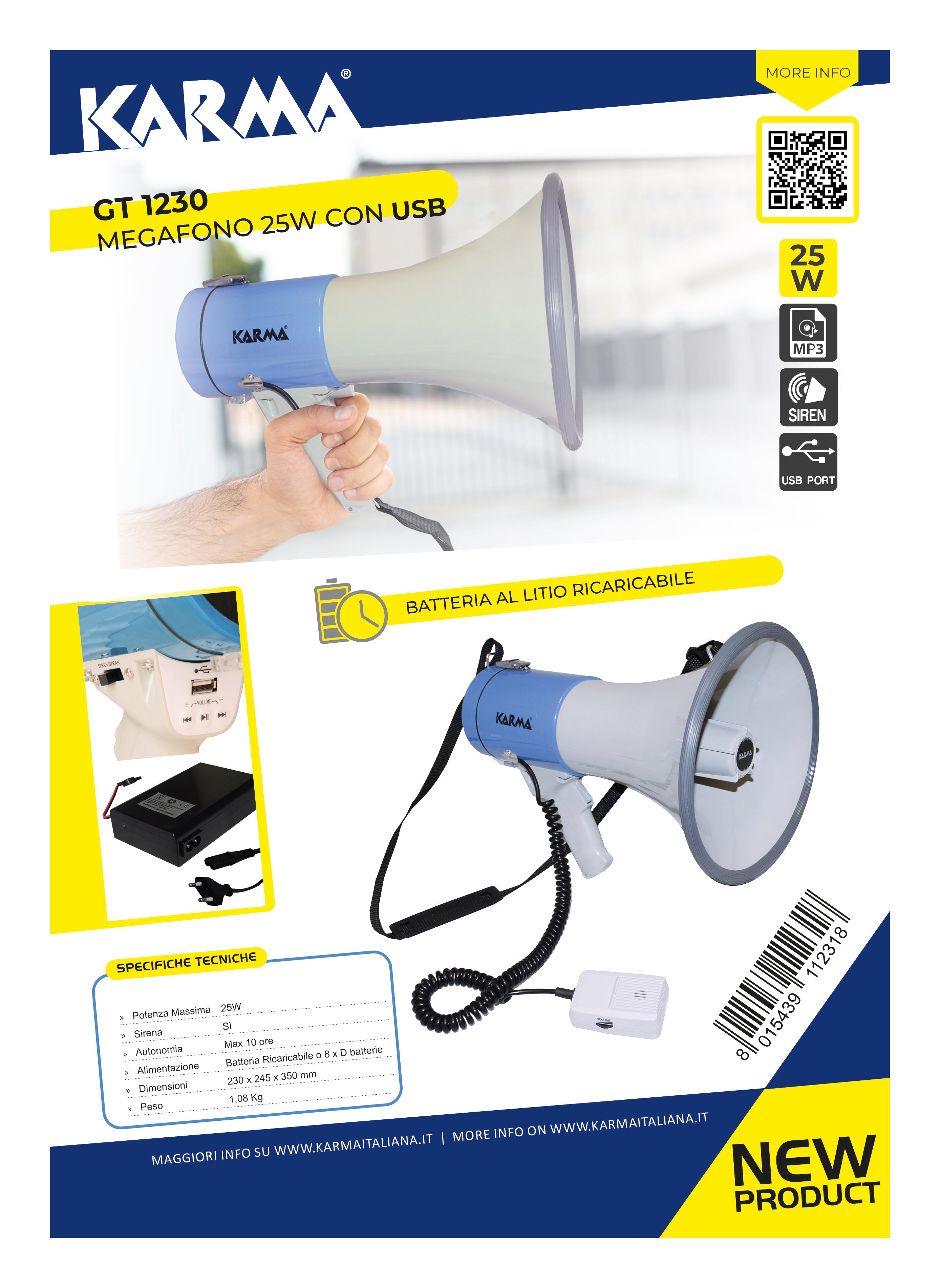 Di grande potenza 25W, è udibile fino ad una distanza di circa 1000 mt (in condizioni ottimali) Dispone di lettore MP3 tramite porta USB. Dotato di batteria ricaricabile al Litio inclusa autonomia 10 ore ma si possono utilizzare in alternativa, 8 batterie tipo "D" (non incluse)