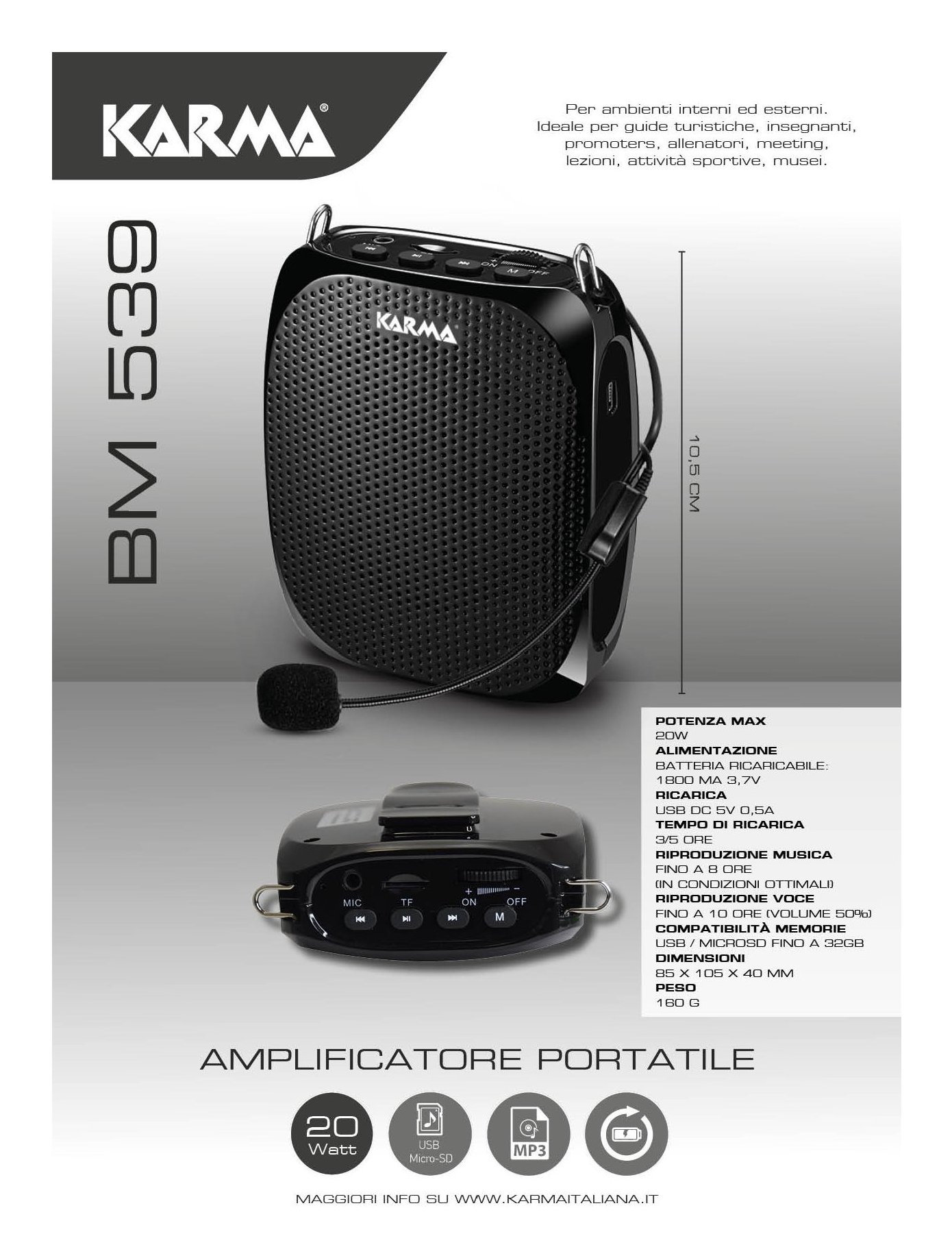 Compatto e leggero, ma estremamente potente. Può essere fissato a cintura o indossato grazie alla cinghietta inclusa. E' ricaricabile e offre un'autonomia fino a 5 ore. Basta inserire il microfono ad archetto nell'apposita presa per renderlo pronto all'uso. Dispone di comando volume e di lettore USB/microSD per la riproduzione di brani Mp3. Ideale per insegnanti, allenatori, guide turistiche, conferenze e per chiunque necessiti di un dispositivo piccolo ed efficace per amplificare la propria voce. La batteria incorporata si ricarica tramite USB (cavo incluso) o alimentatore (NON INCLUSO). Si consiglia di utilizzare una sorgente di alimentazione da 5V, 1A.