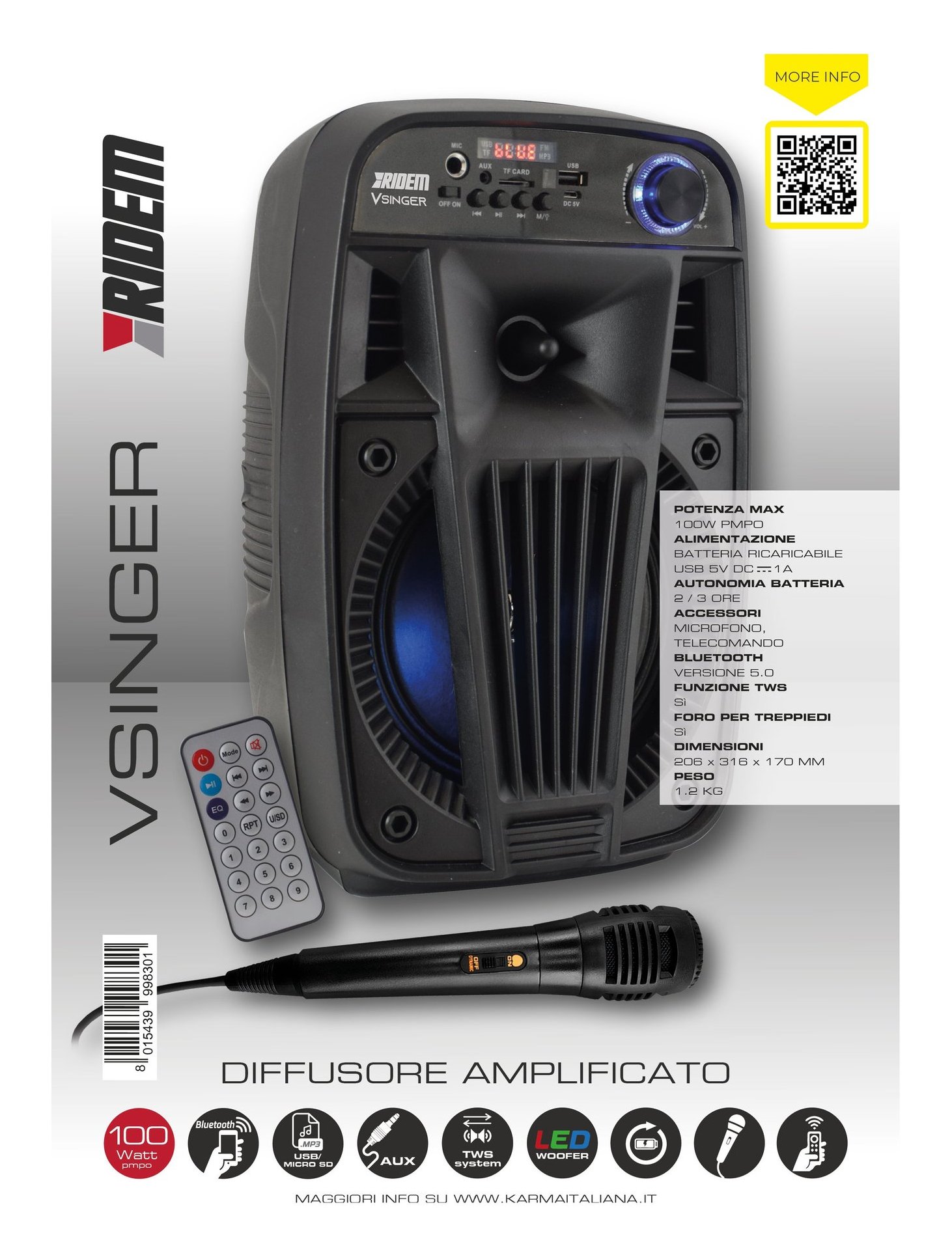 Canta le tue canzoni preferite grazie a questo diffusore amplificato che incorpora sia un lettore MP3 che una ricevente bluetooth. Riproduce i brani contenuti su chiavette USB o schede micro SD e i brani trasmessi da tablet, smartphone tramite bluetooth 5.0 Questo apparecchio dispone della innovativa funzione TWS che consente di riprodurre la musica da smartphone su 2 diffusori contemporaneamente tramite bluetooth.