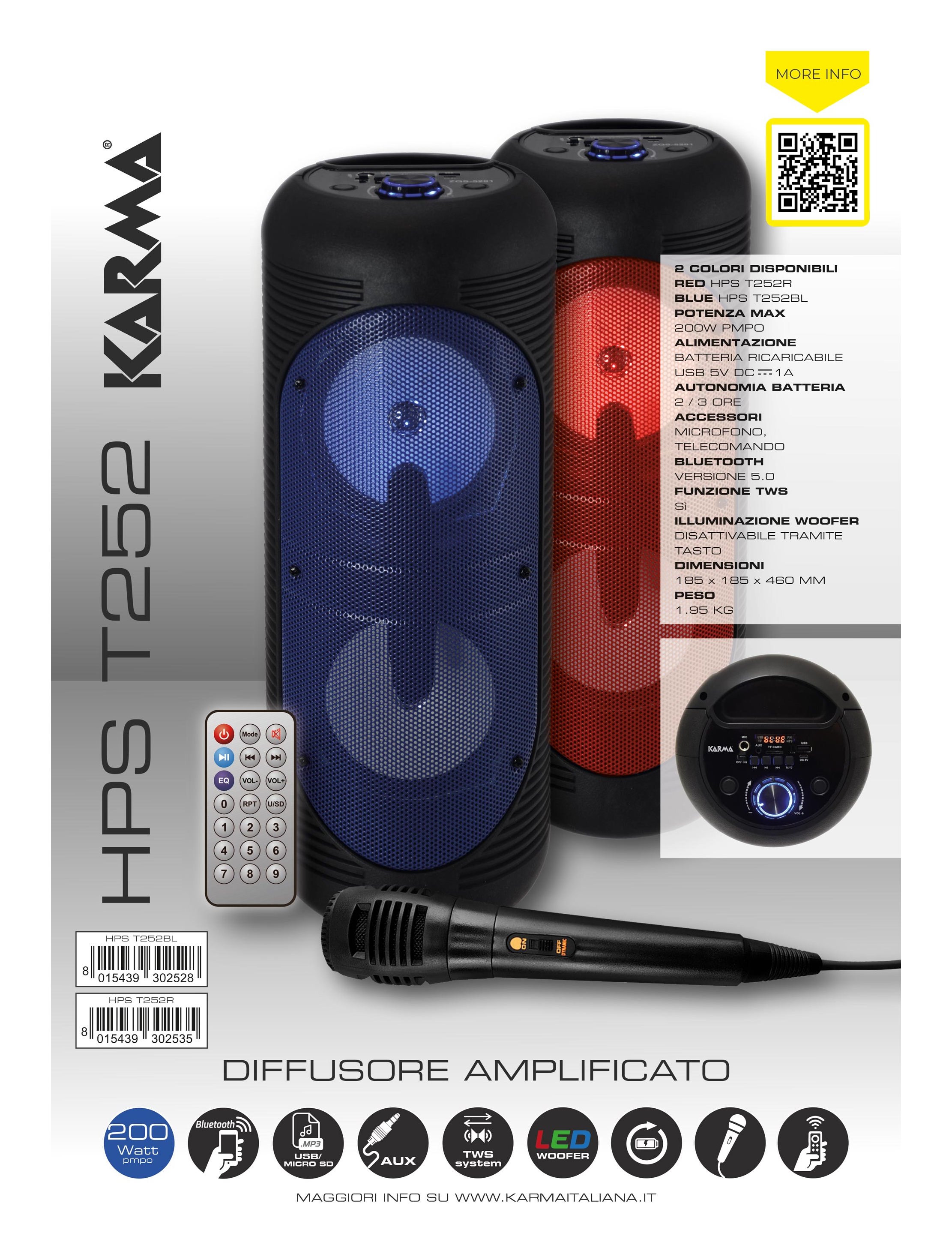 Karma Set karaoke Tws Black e Red 20W HPS T252R Bluetooth Mini-jack 3,5mm, USB, MicroSD, Mic