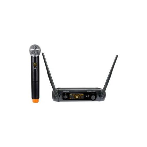 Radiomicrofono palmare operante in banda UHF. Sia il microfono che la base ricevente sono provvisti di display per il controllo della frequenza operativa e del livello di carica della batteria.