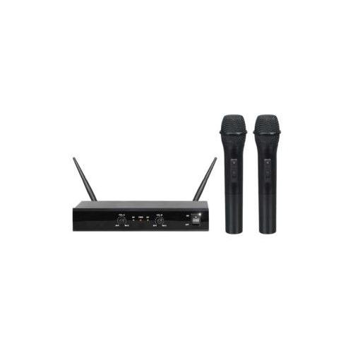 Base ricevente con doppio microfono palmare operanti in banda UHF con un raggio operativo di circa 50mt. La base ricevente è alimentabile tramite normale cavo micro USB (alimentatore in dotazione) mentre i microfoni necessitano di batterie 1,5V di tipo stilo. La base può essere collegata tramite connettore 6,3mm (cavo incluso) ad un comune mixer o amplificatore. I volumi dei due microfoni sono regolabili separatamente. Un led indica lo stato di carica delle batterie.