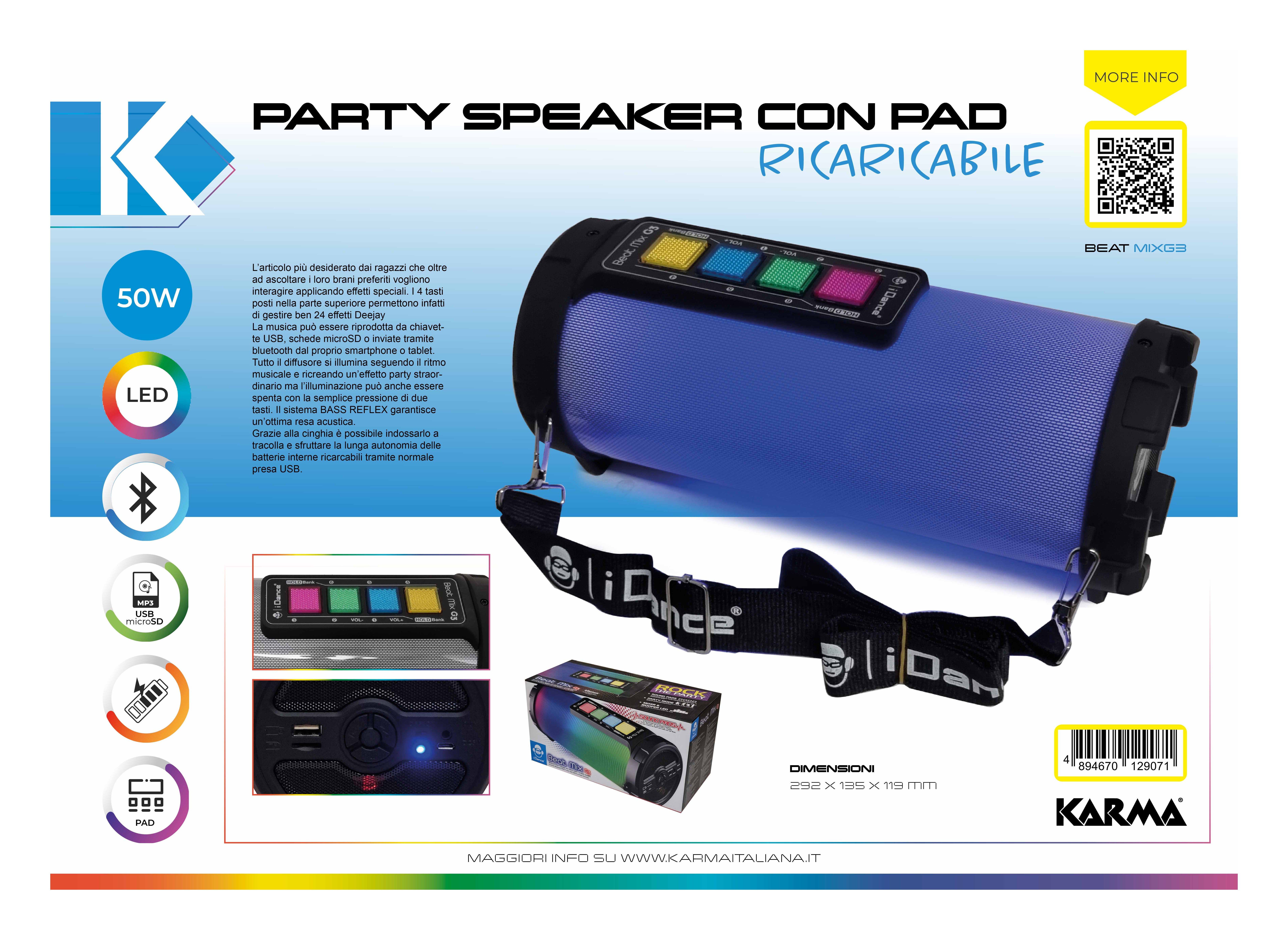 L'articolo più desiderato dai ragazzi che oltre ad ascoltare i loro brani preferiti vogliono interagire applicando effetti speciali. I 4 tasti posti nella parte superiore permettono infatti di gestire ben 24 effetti Deejay. La musica può essere riprodotta da chiavette USB, schede microSD o inviate tramite bluetooth dal proprio smartphone o tablet. Tutto il diffusore si illumina seguendo il ritmo musicale e ricreando un'effetto party straordinario ma l'illuminazione può anche essere spenta con la semplice pressione di due tasti.