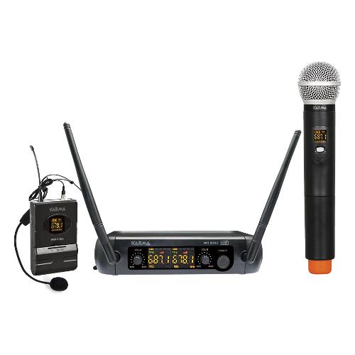 Doppio radiomicrofono ( 1 palmare + 1 ad archetto) operante in banda UHF. Sia i microfoni che la base ricevente sono provvisti di display per il controllo della frequenza operativa e del livello di carica della batteria. La base ricevente è alimentata da una comune presa USB(cavo e alimentatore in dotazione). Grazie a questa peculiarità è collegabile a diffusori amplificati, a mixer, power bank, notebook o a qualsiasi apparecchio disponga di presa USB. Altra caratteristica esclusiva è di poter cambiare la frequenza operativa(16 canali disponibili) direttamente dal microfono senza doverlo fare sulla base. Le pratiche prese sia XLR che tramite Jack 6,3mm consentono il collegamento della ricevente nel modo più semplice e professionale. Alimentazione microfono: 2xAA