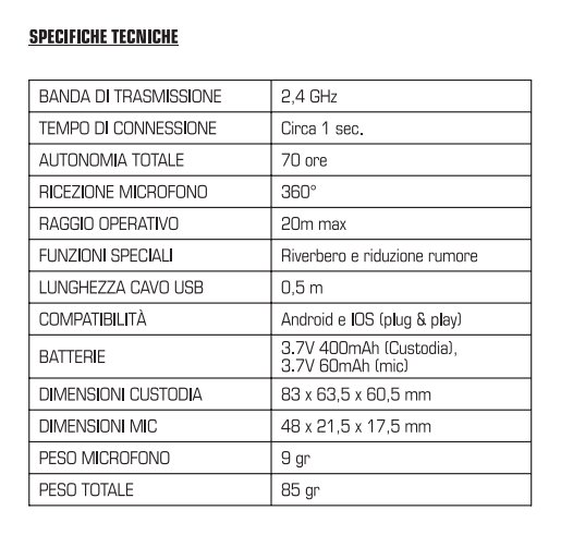 La soluzione migliore per chi realizza interviste o video con il proprio smartphone o tablet. E' composto da un piccolo trasmettitore che va inserito nella presa Tipo-C del telefono e da 2 microfoni da applicare alle persone che parlano e che invieranno la loro voce direttamente alla ricevente.