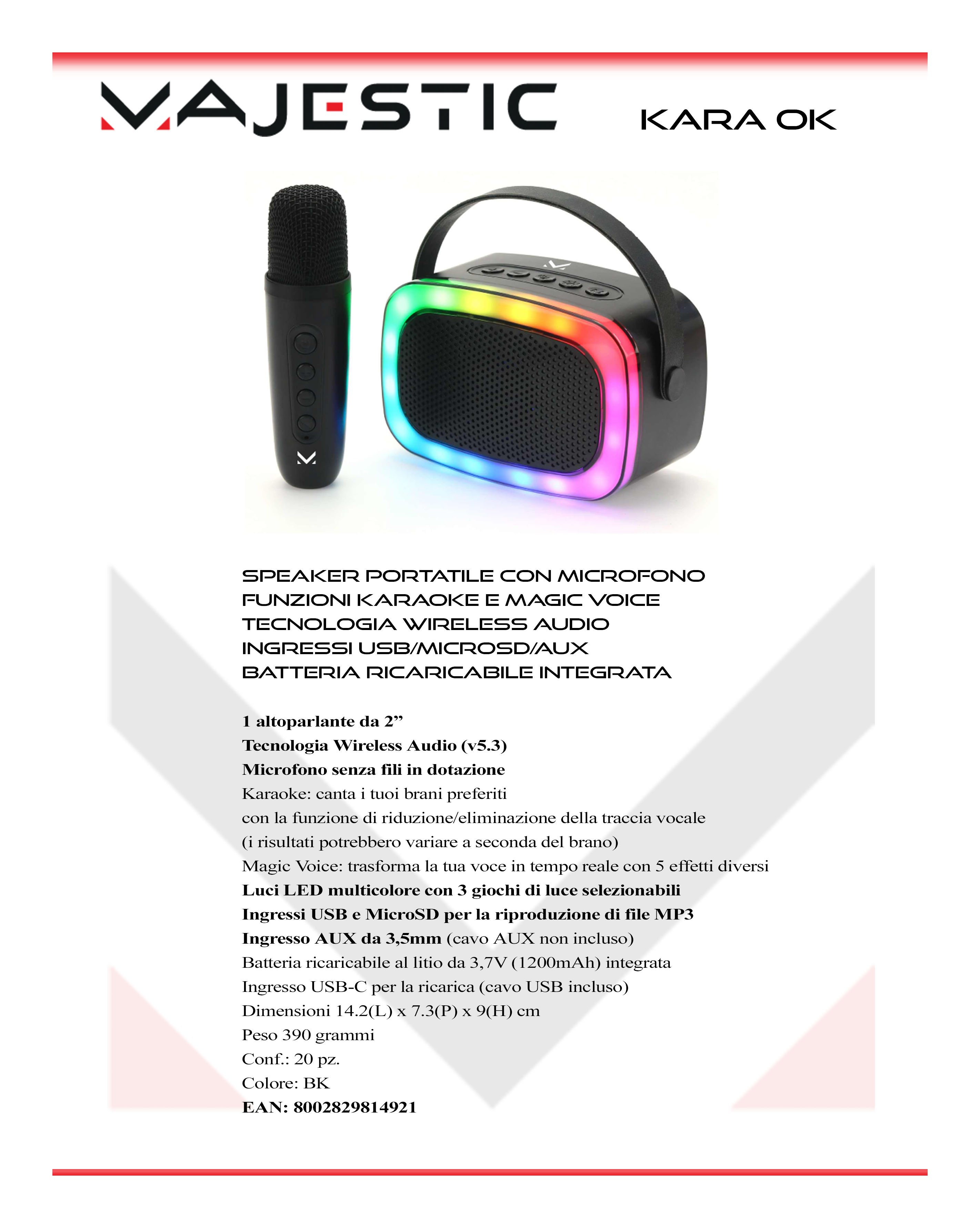 Il KARA-OK è un altoparlante portatile con microfono senza fili e batteria ricaricabile integrata. Le sue dimensioni contenute lo rendono perfetto per giocare e cantare dove vuoi. Puoi ascoltare la musica dal tuo telefono, dal tablet, da una chiavetta USB o da una scheda di memoria microSD e puoi giocare a fare il KARAOKE tramite il comodissimo microfono senza fili.